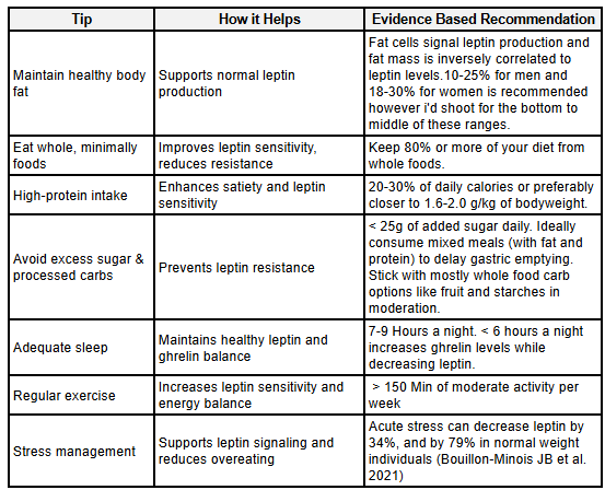 Bouillon-Minois JB, Trousselard M, Thivel D, Benson AC, Schmidt J, Moustafa F, Bouvier D, Dutheil F. Leptin as a Biomarker of Stress: A Systematic Review and Meta-Analysis. Nutrients. 2021 Sep 24;13(10):3350. doi: 10.3390/nu13103350. PMID: 34684349; PMCID: PMC8541372.