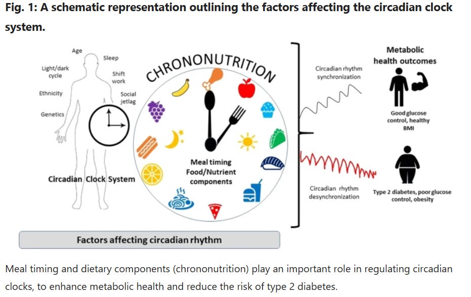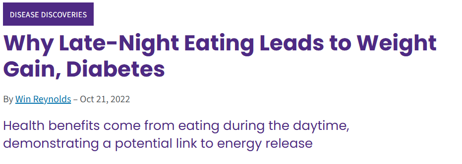 Eating later at night (anytime after the sun goes down) was found to negatively impact blood sugar control. Skipping breakfast is also associated with increased risk of developing metabolic disease, type 2 diabetes, and consuming more total calories.